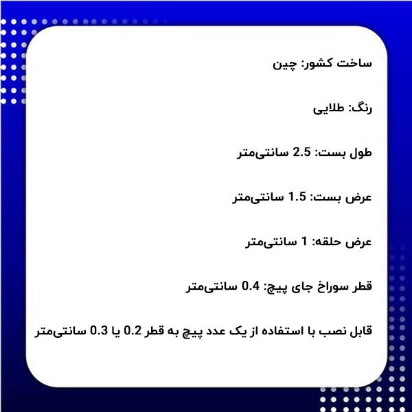 بست تابلو حلقه دار دارای طولی به اندازه 2.5 سانتیمتر میباشد که در پشت انواع تابلوهای چوبی و یا قاب عکسها نصب میشود. این مدل بست تابلو حلقه دار توسط یک عدد پیچ به پشت انواع تابلوهای چوبی قابل نصب است. برای نصب این نوع بست تابلو میتوانید از یک عدد پیچ به قطر 0.2 یا 0.3 سانتیمتر استفاده نمایید. در ادامه متن مشخصات فنی بست تابلو قاشقی طلایی ارائه خواهد شد.
