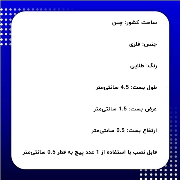 برای نصب این نوع بست بست پشت تابلو باید از دو عدد پیچ به قطر 0.5 سانتیمتر استفاده نمایید. مشخصات فنی بست تابلو به صورت زیر میباشد:
