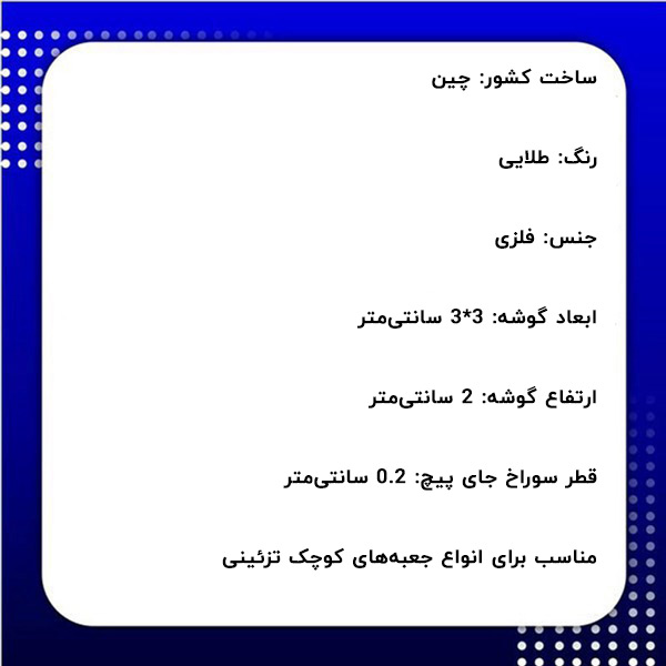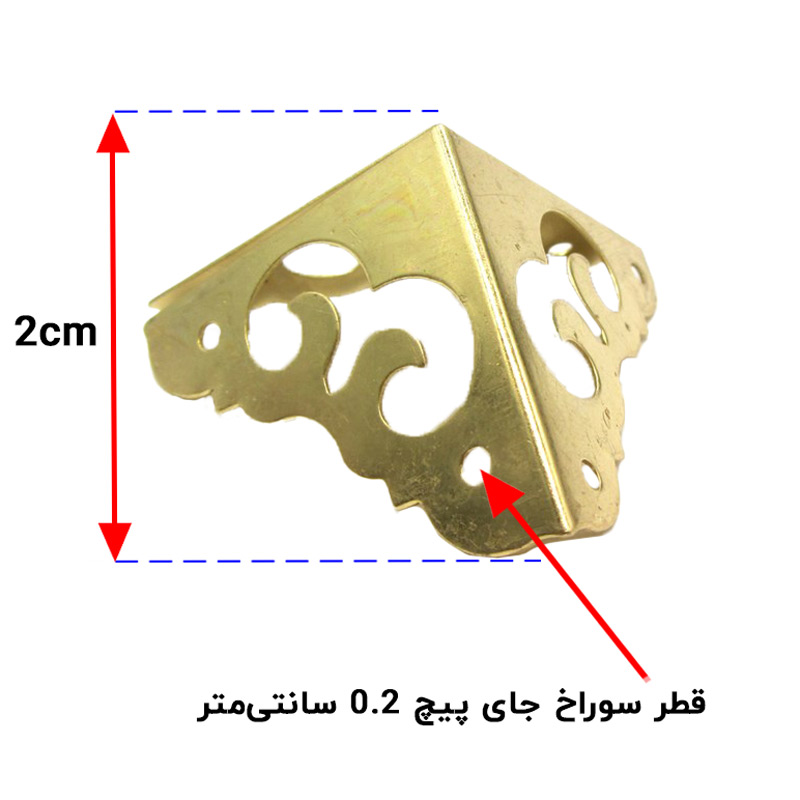 برای نصب این نوع گوشه آنتیک تزئینی میتوانید از 6 عدد پیچ یا میخ ریز به قطر 0.2 سانتیمتر استفاده نمایید. مشخصات فنی گوشه آنتیک تزئینی به شرح زیر است: