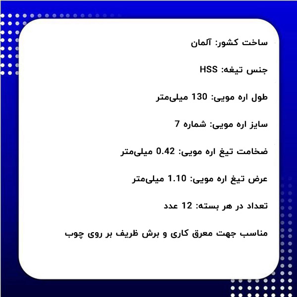 تیغ اره مویی معرق کاری از جنس فولاد تندبر بوده که نقش موثری در افزایش کیفیت و دوام این محصول دارد. همچنین این نوع تیغ اره مویی معرق کاری در آلمان تولید شده است و دارای مشخصات فنی به شرح زیر میباشد: