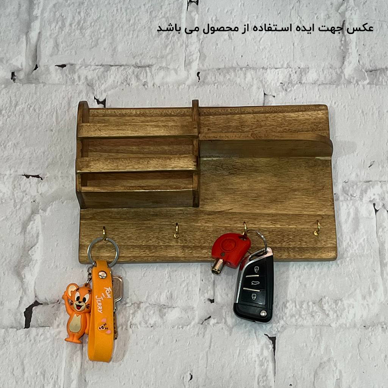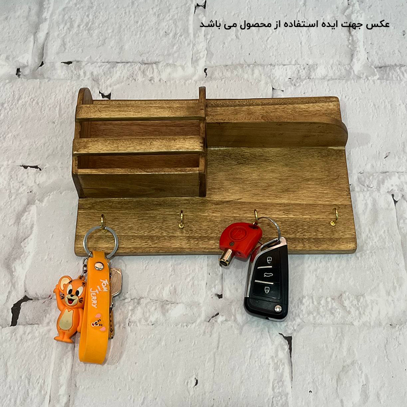 همان طور که در بخش قبل گفته شد از لوازم چوبی علاوه بر کاربرد واقعی برای زیباتر شدن محیط اطراف استفاده میشود. جا کلیدی چوبی دست ساز به شکلی تولید شده است که فضای قرار دادن لوازم دکوری و استند موبایل نیز دارد. همچنین این مدل جاکلیدی دارای 4 آویز و قلاب جای کلید و سوئیچ میباشد. با توجه به این که این مدل جا کلیدی از چوب تولید شده است نباید به طور مستقیم درگیر شستشو با آب بشود بهتر است برای تمیز کردن آن از پارچه نرم و نمدار استفاده کنید. تمیز کردن با پارچه های زبر و خشن یا شستن با ماشین لباسشویی باعث میشود که این محصول آسیب ببیند.