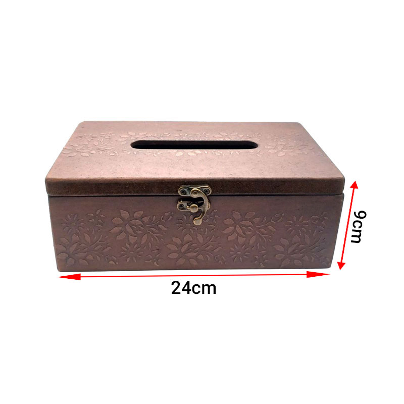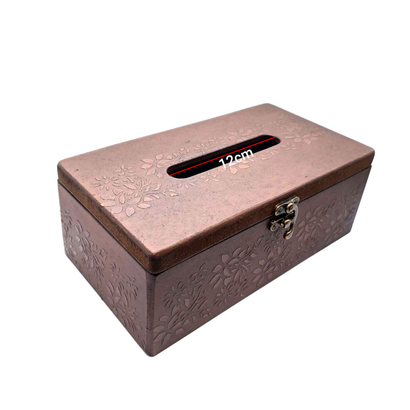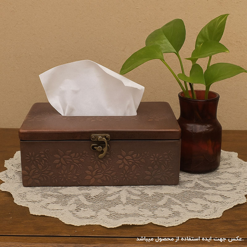 همان طور که در بخش قبل ذکر شد برای نگهداری دستمال کاغذی از جعبه های دکوری و شیک استفاده میشود. این مدل جعبه دستمال چفت دار از جنس چوب طبیعی است و با پوشش روغن گیاهی پوشش دهی شده است. برای دوام و ماندگاری بهتر است در معرص نور شدید و رطوبت قرار نگیرد. با توجه به دست ساز بودن وجود ترک، گره و تفاوت جزیی در ابعاد و رنگ کاملا طبیعی است.