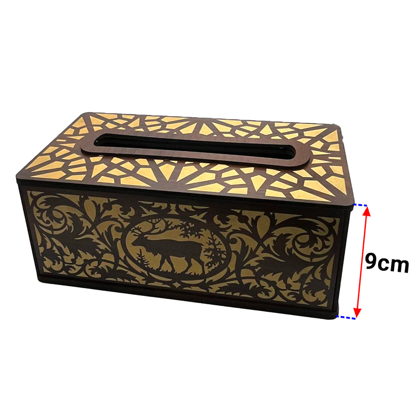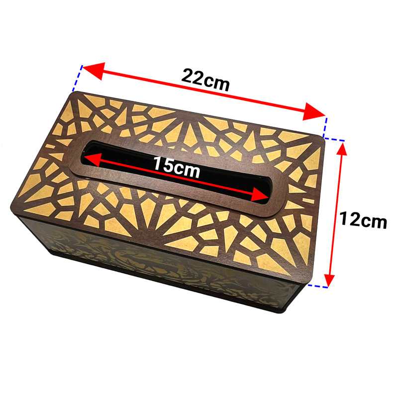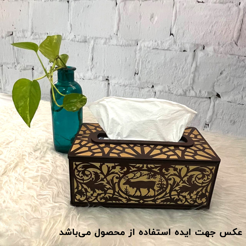 همان طور که در بخش قبل ذکر شد برای نگهداری دستمال کاغذی از جعبههای دکوری و شیک استفاده میشود. این مدل جعبه از جنس ام دی اف 3 میل است و با رنگ گردویی و طرحهای حکاکی تولید شده است که به همراه جعبههای پذیرایی و ظروف سرو این سبک دکور، دیزاین زیبایی ایجاد میکند. همچنین لازم به ذکر است برای دوام و ماندگاری در معرض نور شدید و رطوبت قرار نگیرد. در ادامه متن مشخصات فنی جعبه دستمال کاغذی چوبی ارائه میگردد.