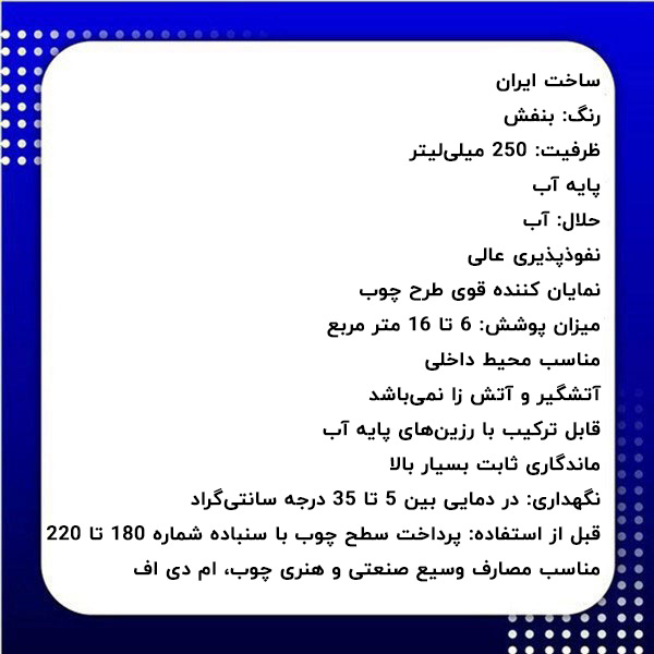 جوهر آستری ویناتو درخشندگی و نفوذپذیری بسیار بالایی روی چوب دارد. این جوهر علاوه بر ویژگیهای برجسته ذکر شده از مشخصات زیر برخوردار میباشد: