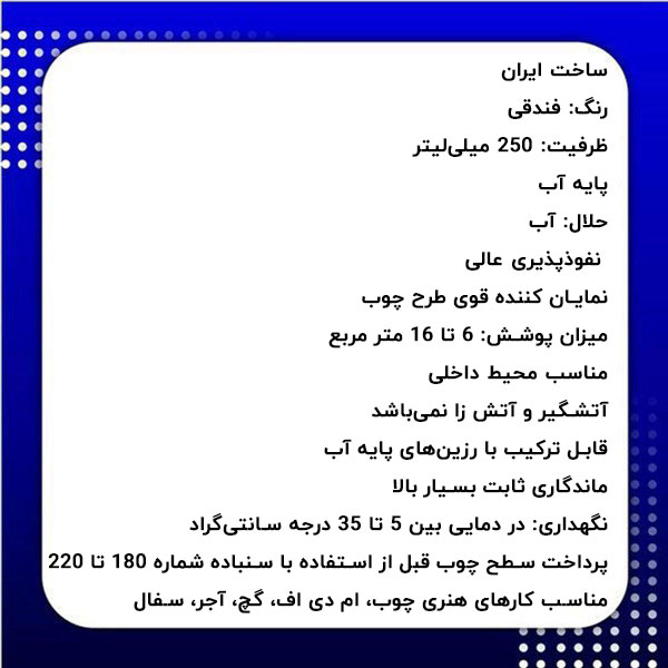 جوهر آستری ویناتو درخشندگی و نفوذپذیری بسیار بالایی روی چوب دارد. این جوهر علاوه بر ویژگیهای برجسته ذکر شده از مشخصات زیر برخوردار میباشد: