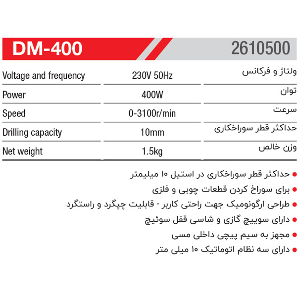 دریل دستی مدل DM-400 از محصولات شرکت Mahak میباشد. سایر مشخصات فنی این محصول به شرح زیر است: