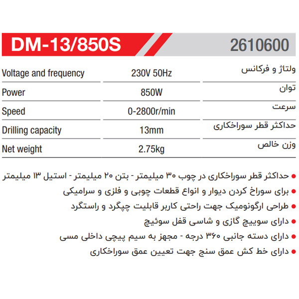 دریل دستی مدل DM-13/850S از محصولات شرکت Mahak میباشد. سایر مشخصات فنی این محصول به شرح زیر است: