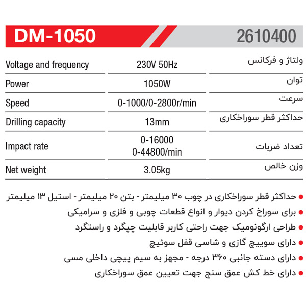 دریل چکشی مدل DM-1050 از محصولات شرکت Mahak میباشد. سایر مشخصات فنی این محصول به شرح زیر است: