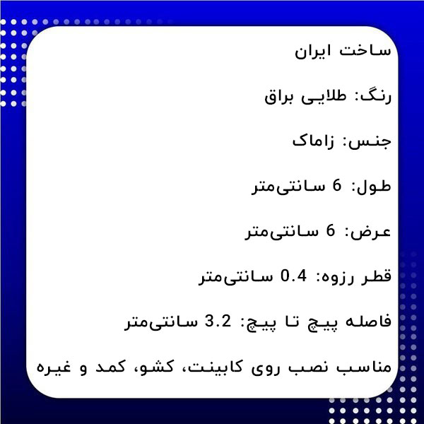 دستگیره یکی از ابزار و یراق ضروری مخصوص کابینتهای کلاسیک آشپزخانه است که قابل استفاده در کشوهای دراور، کمد و غیره نیز میباشد. سایر مشخصات فنی این مدل دستگیره مربعی به شرح زیر میباشد:
