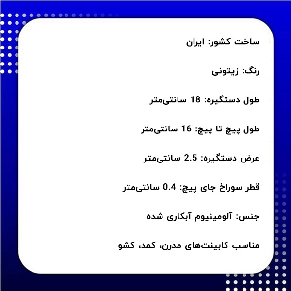 دستگیره خطی زیتونی کمد علاوه بر ویژگیهای ذکر شده، از مشخصات فنی زیر برخوردار میباشد: