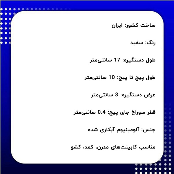 دستگیره مدرن سفید کمد علاوه بر ویژگیهای ذکر شده، از مشخصات فنی زیر برخوردار میباشد: