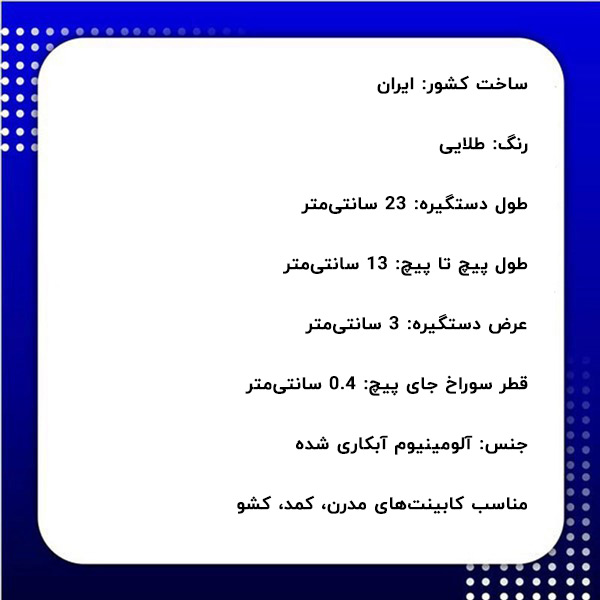دستگیره مدرن طلایی کمد علاوه بر ویژگیهای ذکر شده، از مشخصات فنی زیر برخوردار میباشد: