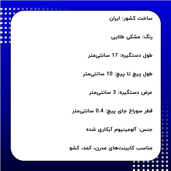 دستگیره مدرن مشکی طلایی کمد علاوه بر ویژگیهای ذکر شده، از مشخصات فنی زیر برخوردار میباشد: