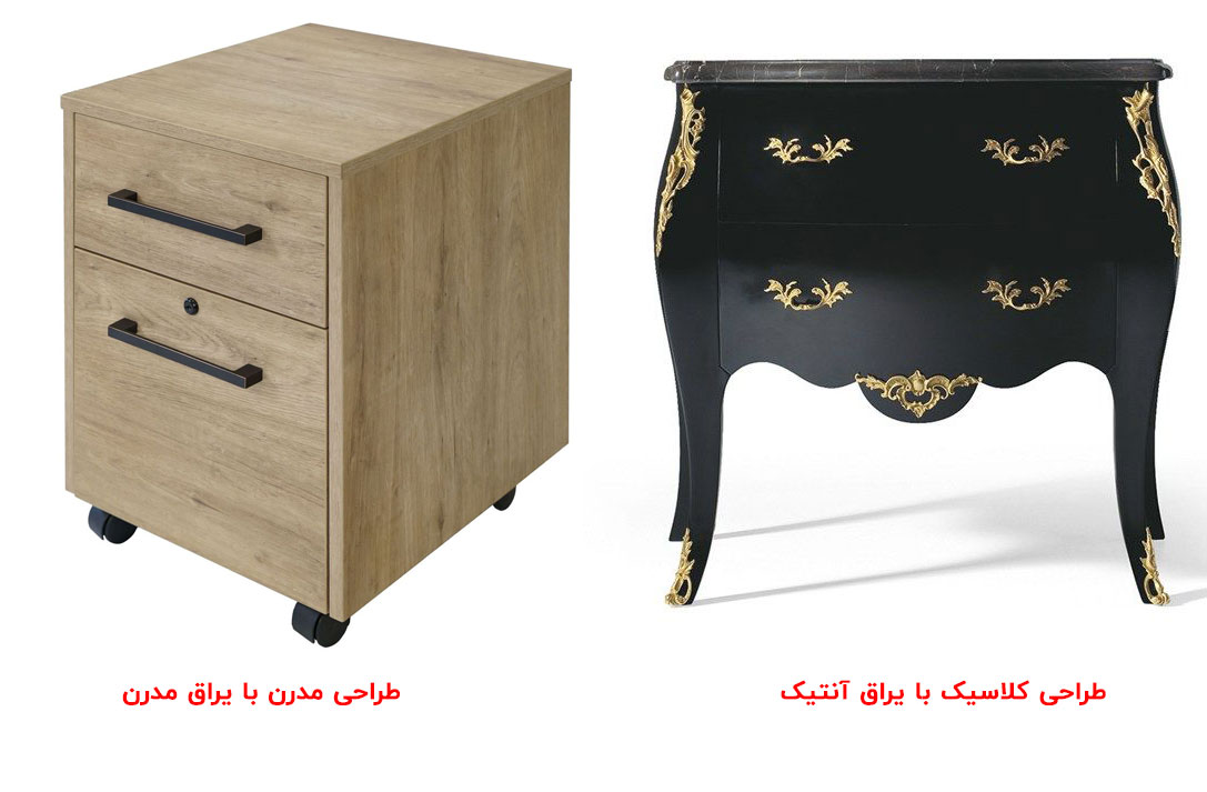 نکته مهمی که باید در زمان خرید در نظر بگیرید اینه که انتخاب بین یراق آنتیک و مدرن بستگی به سلیقه شخصی، نوع دکوراسیون داخلی و سبک و سیاق فضا بستگی داره. برای راحت انتخاب کردن، توی تصویر زیر میتونید سبک مدرن و آنتیک رو با هم مقایسه کنید.