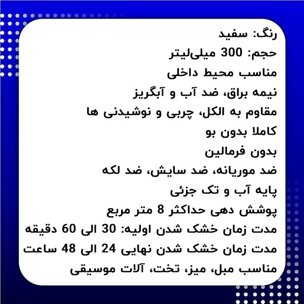 - میزان پوشش دهی 300 میلیلیتر تقریبا 8 متر مربع است که بستگی به ضخامت لایه رنگ بر روی سطح کار دارد.