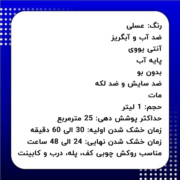 - زمان خشک شدن نهایی: 24 الی 48 ساعت