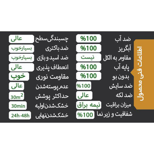 - مدت زمان خشک شدن اولیه: 30 دقیقه الی 1 ساعت