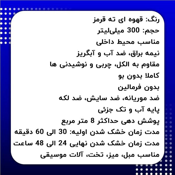 - میزان پوشش دهی 300 میلیلیتر تقریبا 8 متر مربع است که بستگی به ضخامت لایه رنگ بر روی سطح کار دارد.