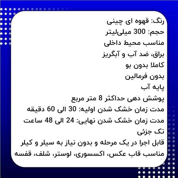 - مدت زمان خشک شدن نهایی: 24 الی 48 ساعت