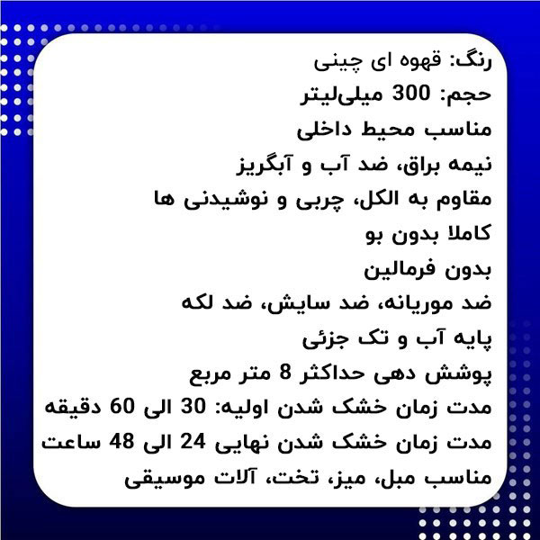 - مدت زمان خشک شدن اولیه: 30 دقیقه الی 1 ساعت