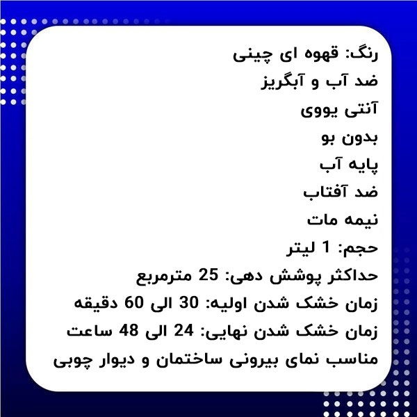- زمان خشک شدن نهایی: 24 الی 48 ساعت