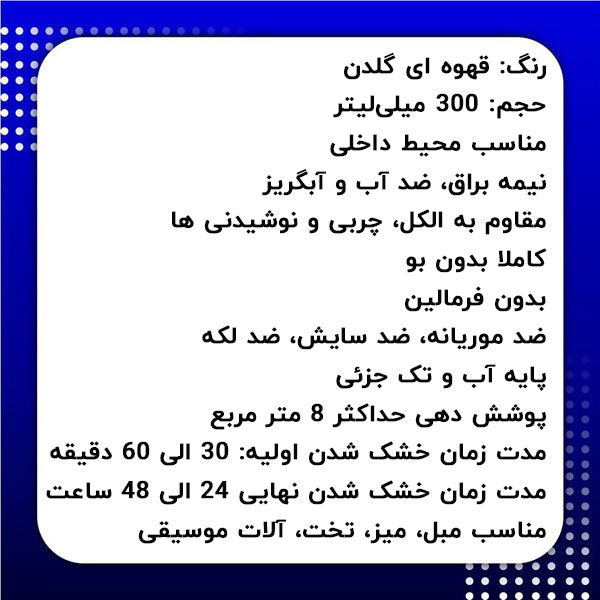 - میزان پوشش دهی 300 میلیلیتر تقریبا 8 متر مربع است که بستگی به ضخامت لایه رنگ بر روی سطح کار دارد.