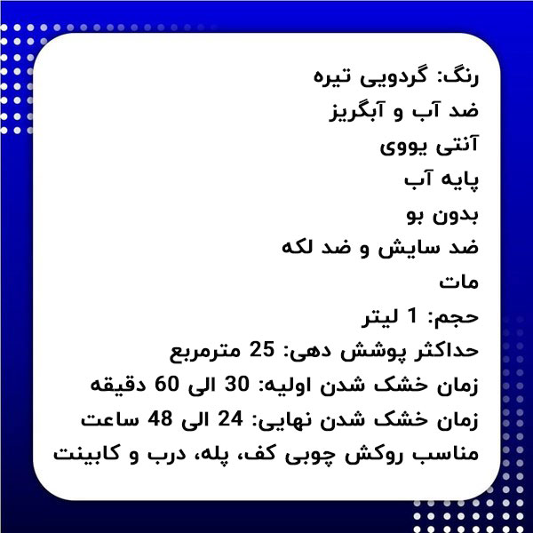 - زمان خشک شدن نهایی: 24 الی 48 ساعت