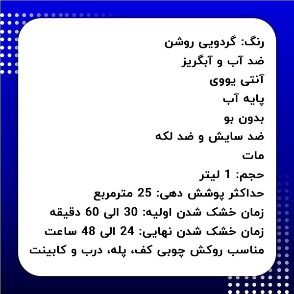 - زمان خشک شدن نهایی: 24 الی 48 ساعت