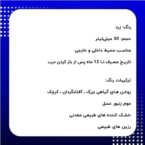 به این نکته توجه داشته باشید که قبل از مصرف خوب هم بزنید و در دمای 25 درجه سانتیگراد یعنی دمای معمولی اتاق اجرا شود. برای روشن تر شدن با روغن بی رنگ نوبن ترکیب نمایید.