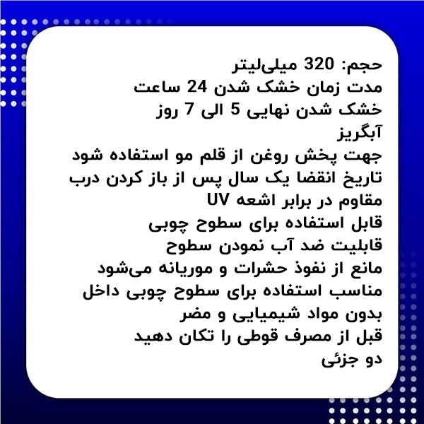 - مناسب استفاده برای سطوح چوبی داخل و خارج از خانه
