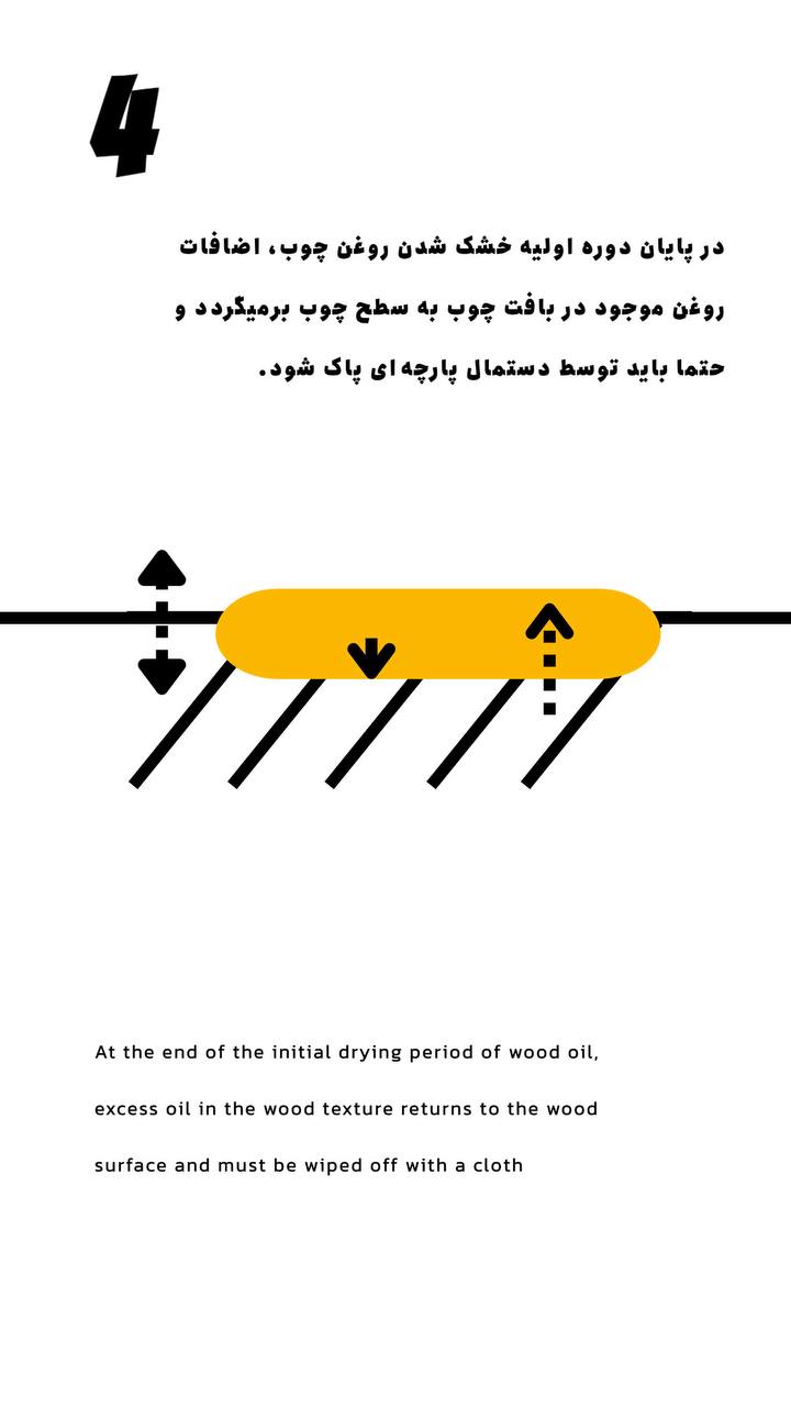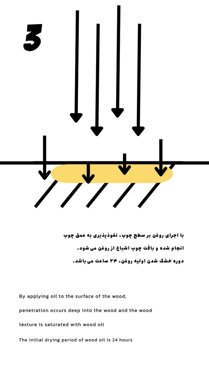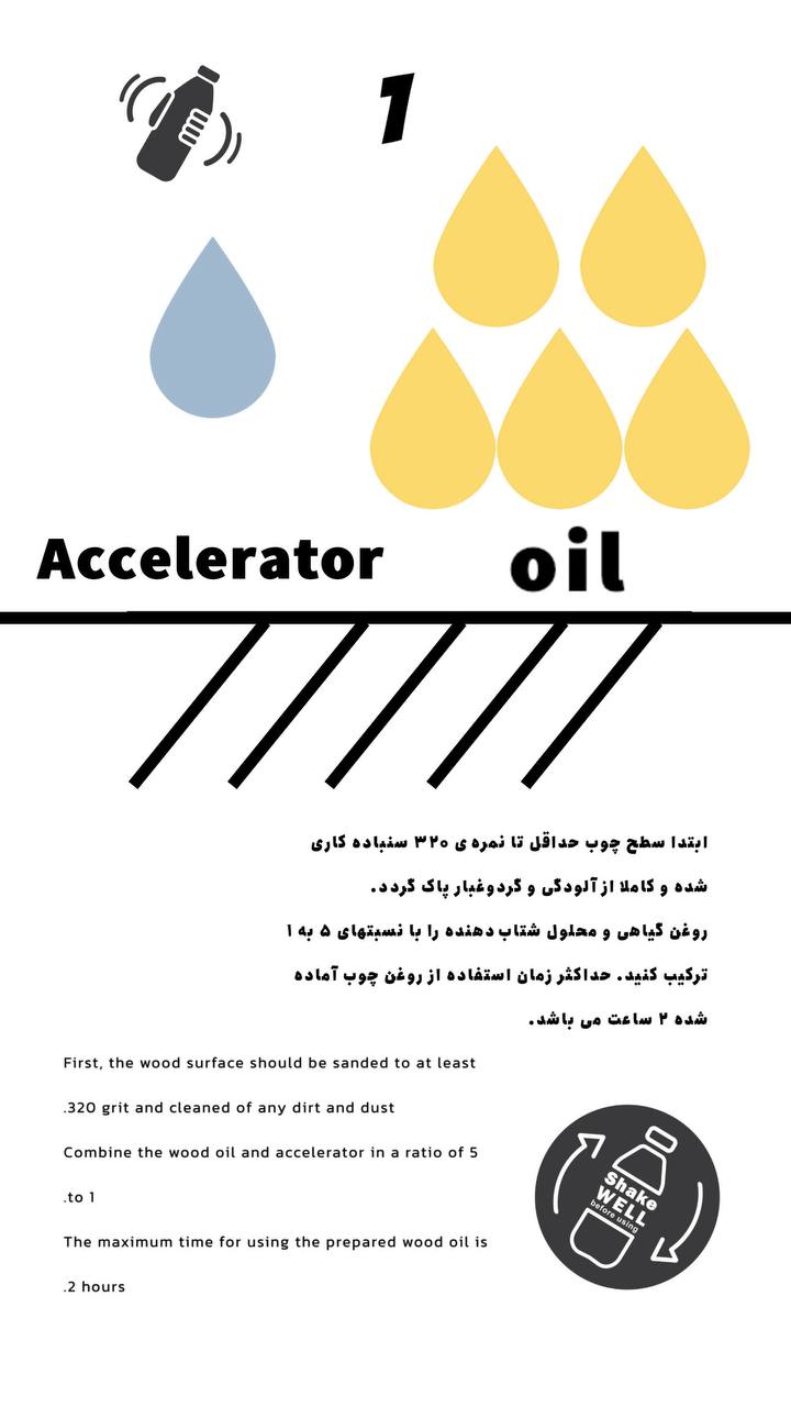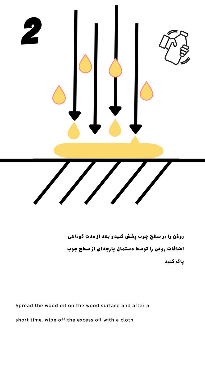 برای استفاده ابتدا سطح چوب را با سنباده 320 ، سنباده بکشید و سطح کاملا از گرد و غبار پاک باشد. روغن گیاهی و محصول شتاب دهنده را به نسبت 5 به 1 ترکیب کنید و دقت داشته باشید این ترکیب بیشتر از 2 ساعت باقی نماند. ترکیب آماده را روی سطح چوب پخش کنید و پس از چند دقیقه اضافات روغن را با کمک دستمال پارچهای تمیز پاک کنید. در این مرحله بافت چوب از روغن اشباع میشود، دوره خشک شدن اولیه 24 ساعت است و پس از آن باز مقداری روغن به سطح چوب برمیگردد و باید با دستمال پارچهای پاک کنید. برای بهتر شدن نتیجه می توانید مجددا یک دست دیگه روغن چوب روی سطح کار اعمال کنید و در نهایت 5 الی 7 روز اجازه بدهید محصول کامل خشک شود. ویژگی های روغن چوب دوجزئی تاپ اویل: