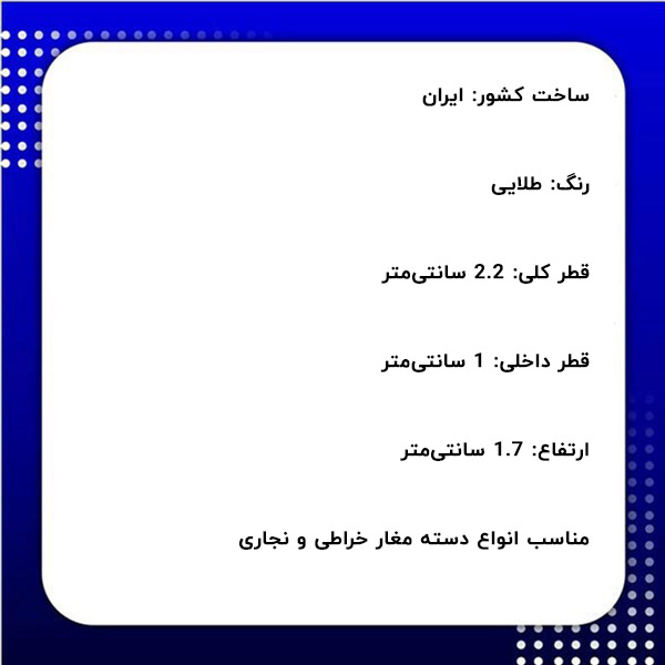 در کارگاههای نجاری که به ساخت و تولید انواع مغار میپردازند، ابزار و یراقهای مناسب کار را مشاهده خواهید کرد. از مهمترین این تجهیزات حلقه دسته مغار فلزی است که برای اتصال دسته و جا زدن آن مورد استفاده قرار میگیرد. از طرفی حلقه یا رینگ مغار برای محافظت دسته مغار هنگام جا زدن بر روی مغار استفاده میشود. رینگ فلزی علاوه بر زیبایی، از ترک خودن دسته هنگام فشار جلوگیری میکند. اگر بخواهید دسته مغار خراطی یا نجاری و دیگر ابزارها را تعویض کنید، به این حلقهها نیاز دارید. برای اتصال رینگ به دسته مغار فقط کافی است آن را جا بندازید که با فشار دست به راحتی قابل انجام میباشد. همچنین برای اطمینان از محکم بودن میتوانید از چسب نیز استفاده نمایید. در ادامه متن مشخصات فنی رینگ دسته مغار طلایی ارائه میگردد.