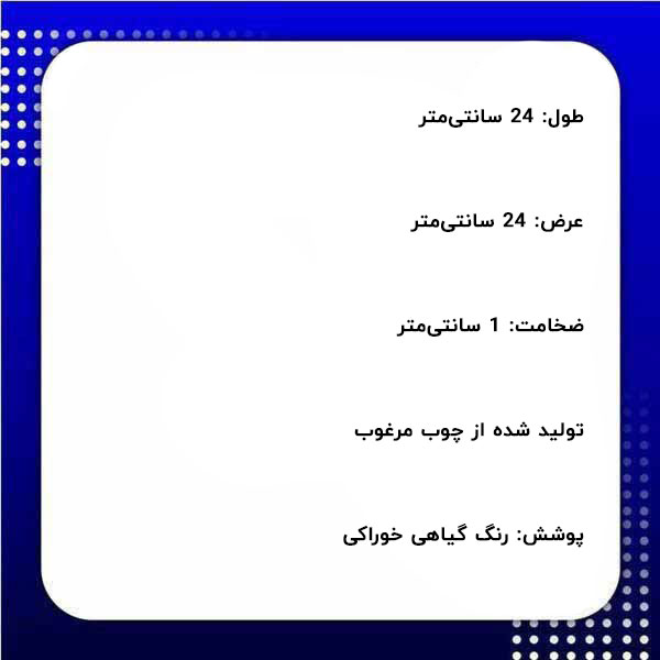 برای اطلاع از قیمت زیر قابلمه ای لطفا به تگ قیمت محصول مراجعه فرمایید و در صورت نیاز به مشاوره قبل از خرید، با چوبینر تماس حاصل نمایید.