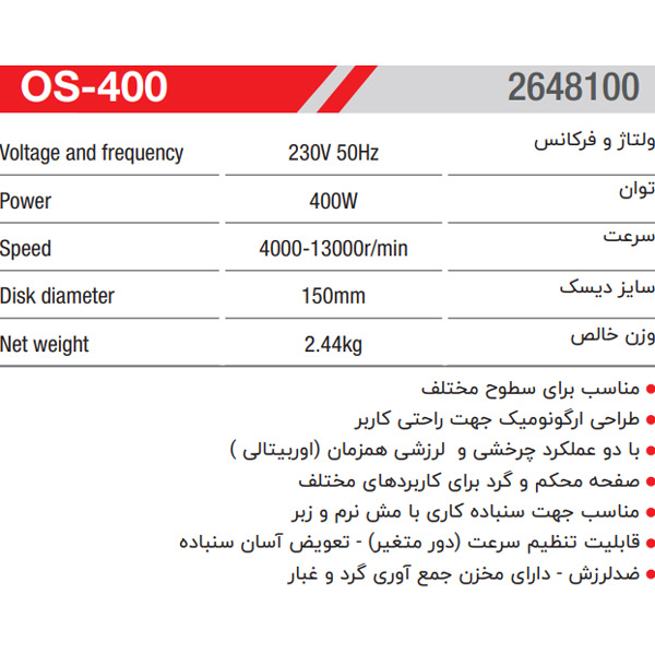 سنباده زن مشتی Mahak مدل OS-400 ابزاری برقی برای کارگاههای نجاری میباشد. به طور کلی این مدل سنباده زن Mahak دارای مشخصات فنی به شرح زیر میباشد: