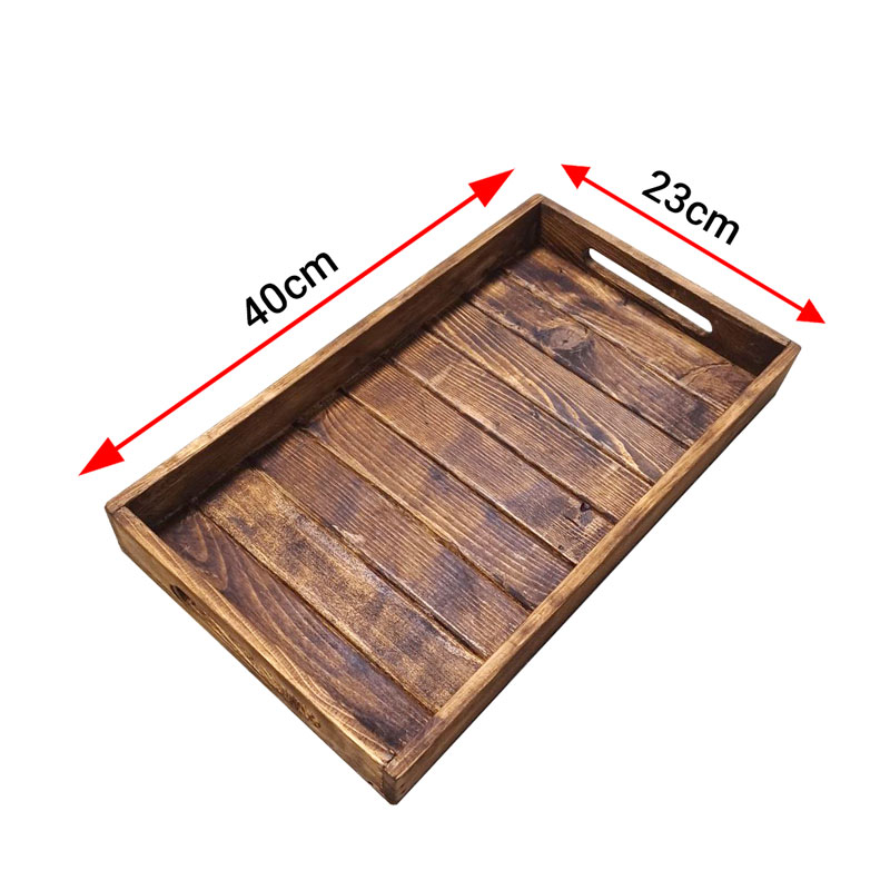 همان طور که در بخش قبل ذکر شد از ظروف چوبی جهت پذیرایی در منازل، رستوران، کافه و محیط کار استفاده میشود که سینی یک نمونه از این ظروف است. سینی چوبی در اشکال هندسی مختلفی از قبیل دایره، مستطیل، مربع و... ساخته میشود و علاوه بر پذیرایی از این ظروف میتوان در دکوراسیون منازل استفاده نمود. سینی دکوری از جنس چوب روسی درجه یک و به صورت مستطیل 40 در 23 سانتیمتر تولید و با روغن جلا پوشش دهی شده است. برای تمیز کردن سینی در صورتی که آب بر روی کار ریخته شود دچار آسیب میشود و باید بلافاصله با پارچه نرم خشک شوند.