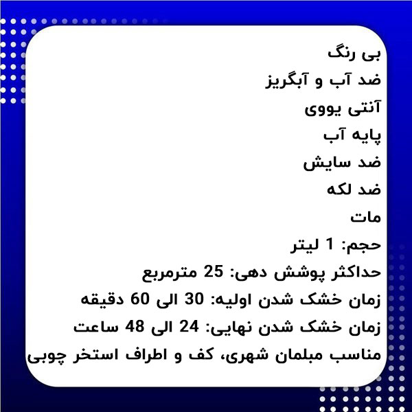 - زمان خشک شدن نهایی: 24 الی 48 ساعت