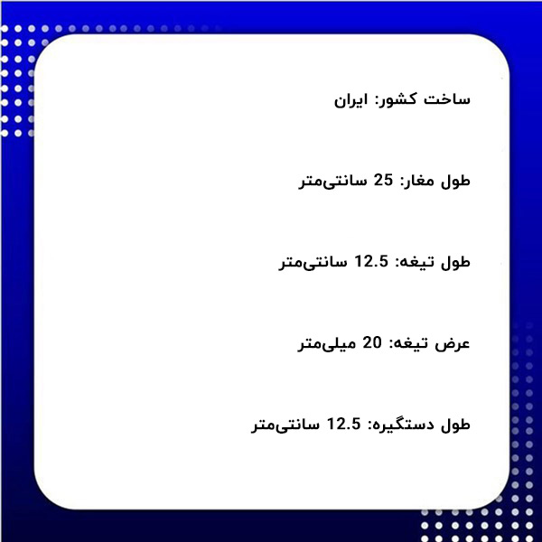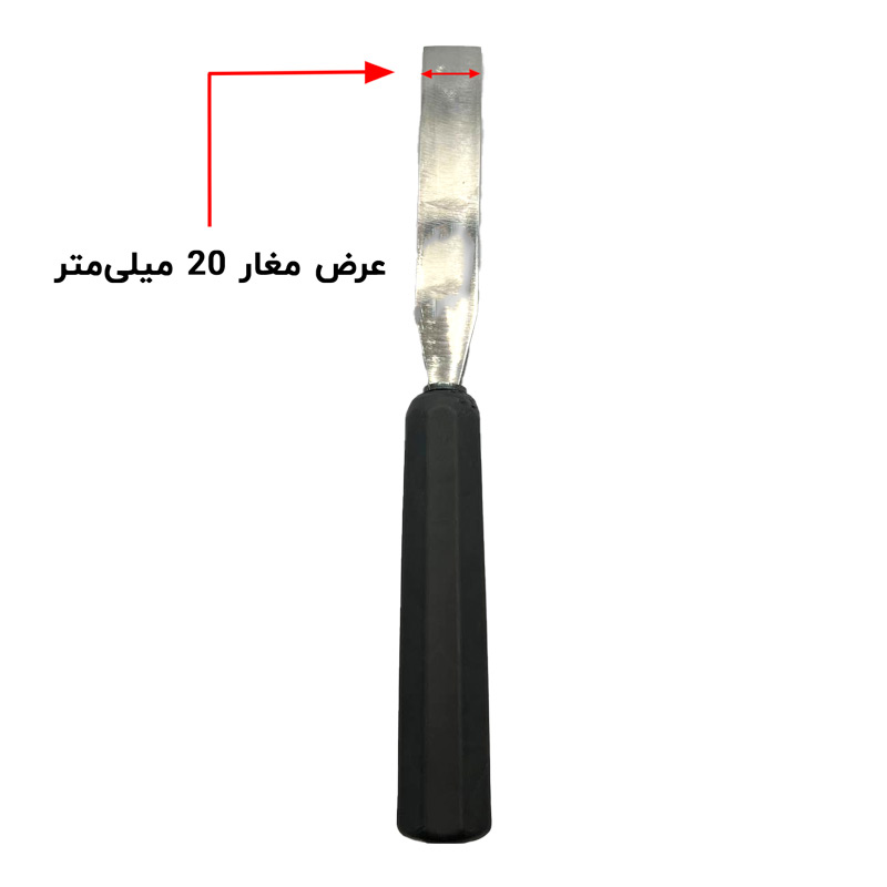 همانطور که در قسمت قبل اشاره کردیم مغار ابزاری برای کنده کاری بر سطح چوب میباشد و از دو قسمت تیغه بلند و دسته تشکیل شده است. تیغه دارای کلگی و سری تیز و برنده است که جهت استفاده ضربههایی بر قسمت انتهایی دستگیره وارد میشود تا کار کنده کاری انجام گیرد. این مدل مغار تخت دارای دسته پلاستیکی است که به سبب جنس آن مانع از عرق کردن کف دست میشود. مفار تخت Aryana سایز 20 میلیمتر ساخت ایران میباشد. در ادامه متن مشخصات فنی در خصوص ای مغار ارائه میگردد.