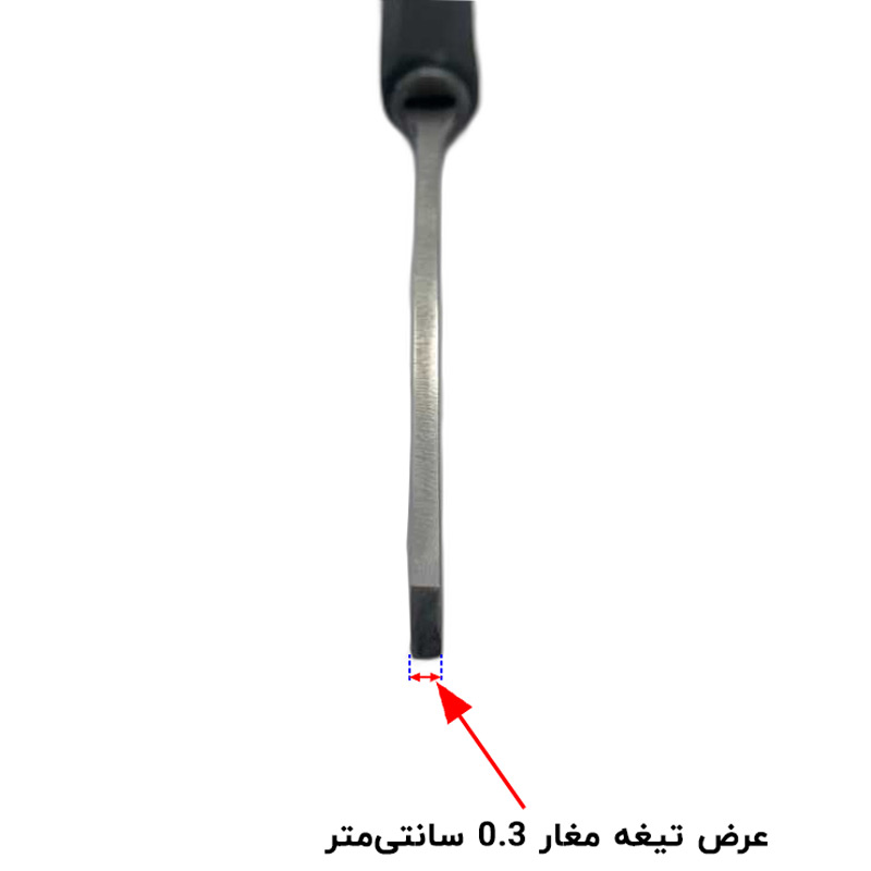 همانطور که در قسمت قبل اشاره کردیم مغار ابزاری برای کنده کاری بر سطح چوب میباشد و از دو قسمت تیغه بلند و دسته تشکیل شده است. تیغه دارای کلگی و سری تیز و برنده است که جهت استفاده ضربههایی بر قسمت انتهایی دستگیره وارد میشود تا کار کنده کاری انجام گیرد. این مدل مغار تخت دارای دسته پلاستیکی است که به سبب جنس آن مانع از عرق کردن کف دست میشود. مفار تخت آریانا سایز 3 میلیمتر ساخت ایران میباشد. در ادامه متن مشخصات فنی مغار سر تخت آریانا ارائه میگردد.
