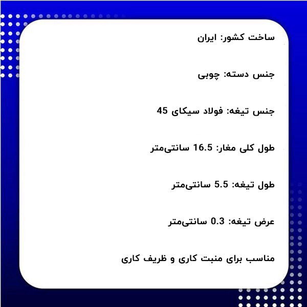 مغار ابزاری برای کنده کاری بر سطح چوب میباشد و از دو قسمت تیغه بلند و دسته تشکیل شده است. تیغه دارای کلگی و سری تیز و برنده است که جهت استفاده ضربههایی بر قسمت انتهایی دسته وارد میشود تا کار کنده کاری انجام گیرد. این مدل مغار شفره ظریف کاری دارای دسته چوبی میباشد که به سبب جنس چوبی که دارد مانع از عرق کردن کف دست میشود. در ادامه متن مشخصات فنی مغار منبت شفره ارائه میگردد.