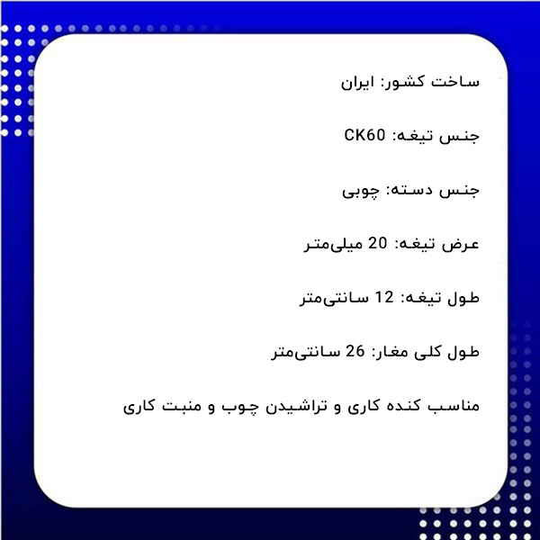 مغار ابزاری برای کنده کاری بر سطح چوب میباشد و از دو قسمت تیغه و دسته تشکیل شده است. تیغه دارای کلگی و سری تیز و برنده است که جهت استفاده ضربههایی بر قسمت انتهایی دسته وارد میشود تا کار کنده کاری انجام گیرد. این مدل مغار قاشقی منبت کاری دارای دسته چوبی میباشد که به دلیل جنس چوبی آن مانع عرق کردن کف دست میشود. مغار نیم باز قاشقی برای کنده کاری و تراشیدن چوب، کارهای ظریف و منبت کاری مورد استفاده قرار میگیرد. در ادامه مشخصات فنی مغار قاشقی ارائه میگردد.