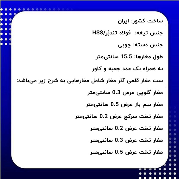 همانگونه که در قسمت قبل اشاره کردیم مغارها انواع مختلفی دارند که هر کدام کاربرد خاصی برخوردار میباشند. مغار در حالت کلی از دو قسمت تیغه و دسته تشکیل شده است. مجموعه مغار چاقویی شامل 6 عدد مغار مدادی با تیغههای مختلف است. لازم به ذکر است که تیغه این مغارها فولادی بوده و از کیفیتی بالایی برخوردار است. از دیگر مزیتهای مجموعه مغار مدادی میتوان به جنس دسته مغارها اشاره نمود که چوبی است لذا هنگام کار دست دچار تعریق نمیشود و کار با آن راحت میباشد. در ادامه متن مشخصات فنی ست مغار قلمی ارائه میگردد.