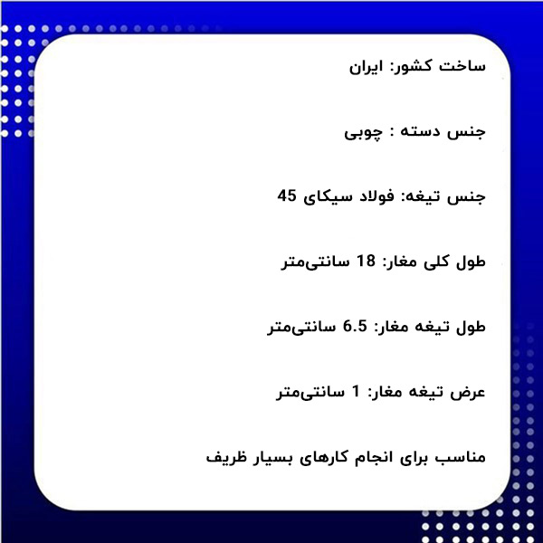 همان طور که ذکر شد از مغار برای کنده کاری و ظریف کاری روی سطح چوب استفاده میشود. تیغه دارای کلگی و سری تیز و برنده است که جهت استفاده ضربههایی بر قسمت انتهایی دسته وارد میشود تا کار کنده کاری انجام گیرد. این مدل مغار چاقویی ظریف کاری مدل ناخنی برای کارهای بسیار ظریف کاربرد دارد. در ادامه متن مشخصات فنی مغار چاقویی ارائه میگردد.