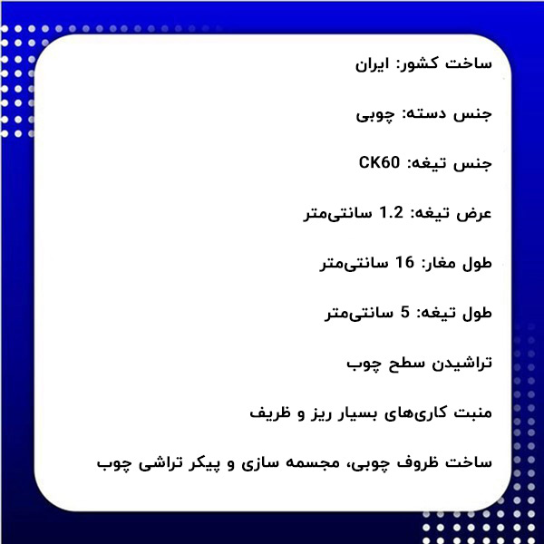 مغار چاقویی پخ دسته چوبی مدادی علاوه بر ویژگیهای ذکر شده، از مشخصات فنی زیر برخوردار میباشد: