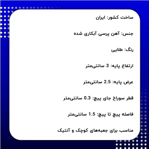 اگر علاقه بسیاری به وسایل آنتیک و قدیمی همچون جعبههای کوچک سنتی، صندوقچههای آنتیک، جعبه جواهرات و غیره دارید، باید از یراقآلاتی در آنها استفاده نمایید تا علاوه بر کاربردی بودن دارای طرح و شکلی آنتیک و سنتی باشند تا زیبایی این مدل جعبهها را دو چندان کند. پایه آنتیک طلایی علاوه بر این که از برخورد بدنه زیرین جعبه با زمین جلوگیری میکند، جلوه خاص و آنتیکی را نیز به جعبه خواهد بخشید. این نوع پایه آنتیک در ابعاد مناسب قابل نصب در چهار گوشه جعبههای آنتیک سنتی میباشد که از ضربه و آسیب بدنه جعبه جلوگیری خواهد کرد. در ادامه متن مشخصات فنی پایه آنتیک تزئینی ارائه میگردد.