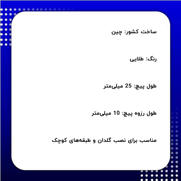 هر فردی برای دکوراسیون و تزیین خانه خود انجام میدهد، نصب طبقه و یا گلدانهای کوچک به دیوار میباشد. برای این کار باید از یک نوع یراق مخصوص استفاده نمایید تا بتوانید به راحتی طبقههای کوچک و یا هر چیز دیگر را به دیوارهای گچی خود نصب نمایید. پیچ ال آنتیک طلایی یک نوع پیچ مخصوص برای این کار میباشد که با استفاده از فلزی مقاوم در چین ساخته شده است. طول کل این نوع پیچ ال 25 میلی متر بوده و طول رزوه آن 10 میلیمتر میباشد. در ادامه متن توضیحات بیشتری در رابطه یا پیچ ال طلایی بیان خواهد شد.