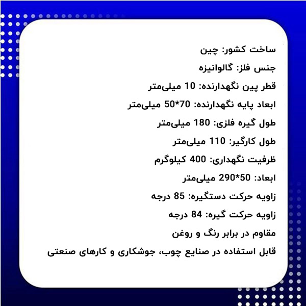 - ابعاد پایه نگهدارنده: 70*50 میلیمتر