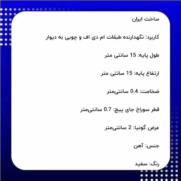 - کاربرد: نگهدارنده طبقات ام دی اف و چوبی به دیوار