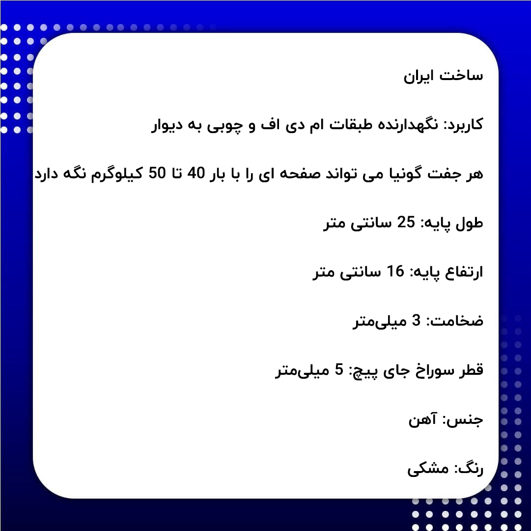 - کاربرد: نگهدارنده طبقات ام دی اف و چوبی به دیوار